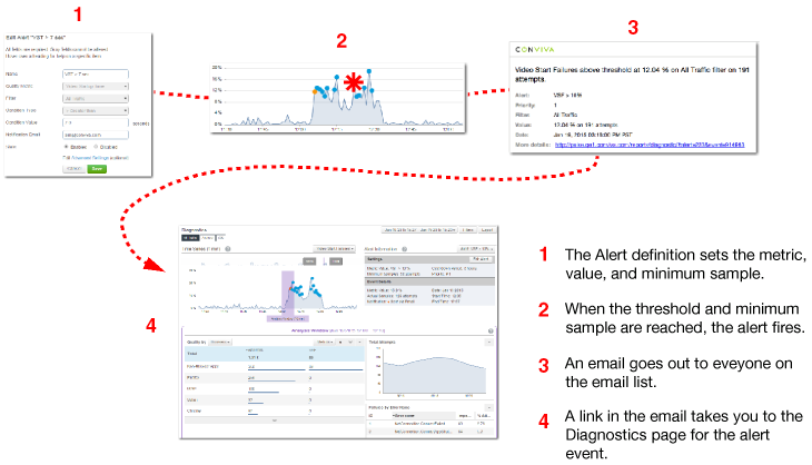 The Conviva ad alerts feature lets you automate the process of monitoring key ad quality and performance metrics, and emailing team members when ad alert conditions occur. You might watch for increases in Ad Start Failures (ASF) or Exits Before Ad Start (EBAS), both of which indicate viewers are not seeing the intended ads. Or, you can notify your Ad Ops team when spikes in Ad Play Failures (APF) indicate a sudden increase in ad delivery or network issues.