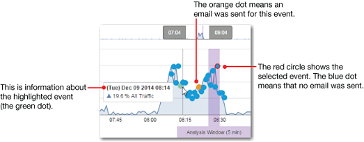 - The main timeline shows all of the activity during the selected time segment, with dots to indicate events. Blue dots are events without notification, the green dot is the one you’re hovering over, and orange dots are events with notifications. The currently selected event has a red circle around the dot. The intervals for this timeline are based on the selected time range (between the two gray sliders). If the time range is less than 6 hours, you see one-minute intervals. If the range is more than 6 hours, you see five-minute intervals.