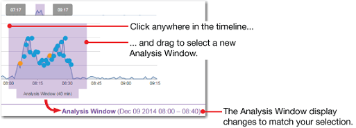 - The purple Analysis Window marker shows the interval during which a selected event occurred. The Analysis Window defaults to a 5-minute range, but you can drag the analysis marker to change the Analysis Window time range.