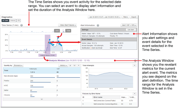 The Diagnostics page shows three grouping of information: the Time Series, Alert Information, and the Analysis Window.