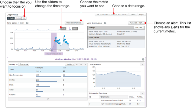 - From the Pulse navigation bar. The Diagnostics page Time Series and Analysis Window display metric data, but the Alert Information block reflects the fact that no alert is selected. You can quickly choose a metric, filters, and an alert to see event data, or you can simply look at the metrics for the time range you select. You might arrive at the Diagnostics page this way when you are already in Pulse and want to investigate a spike in Video Start Failures, for example.
