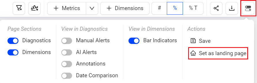 To change the default landing page, in the kebab icon, select Set a landing page (for Trends) Make Default (for other dashboards). The Home icon appears in the page tab of your default page.