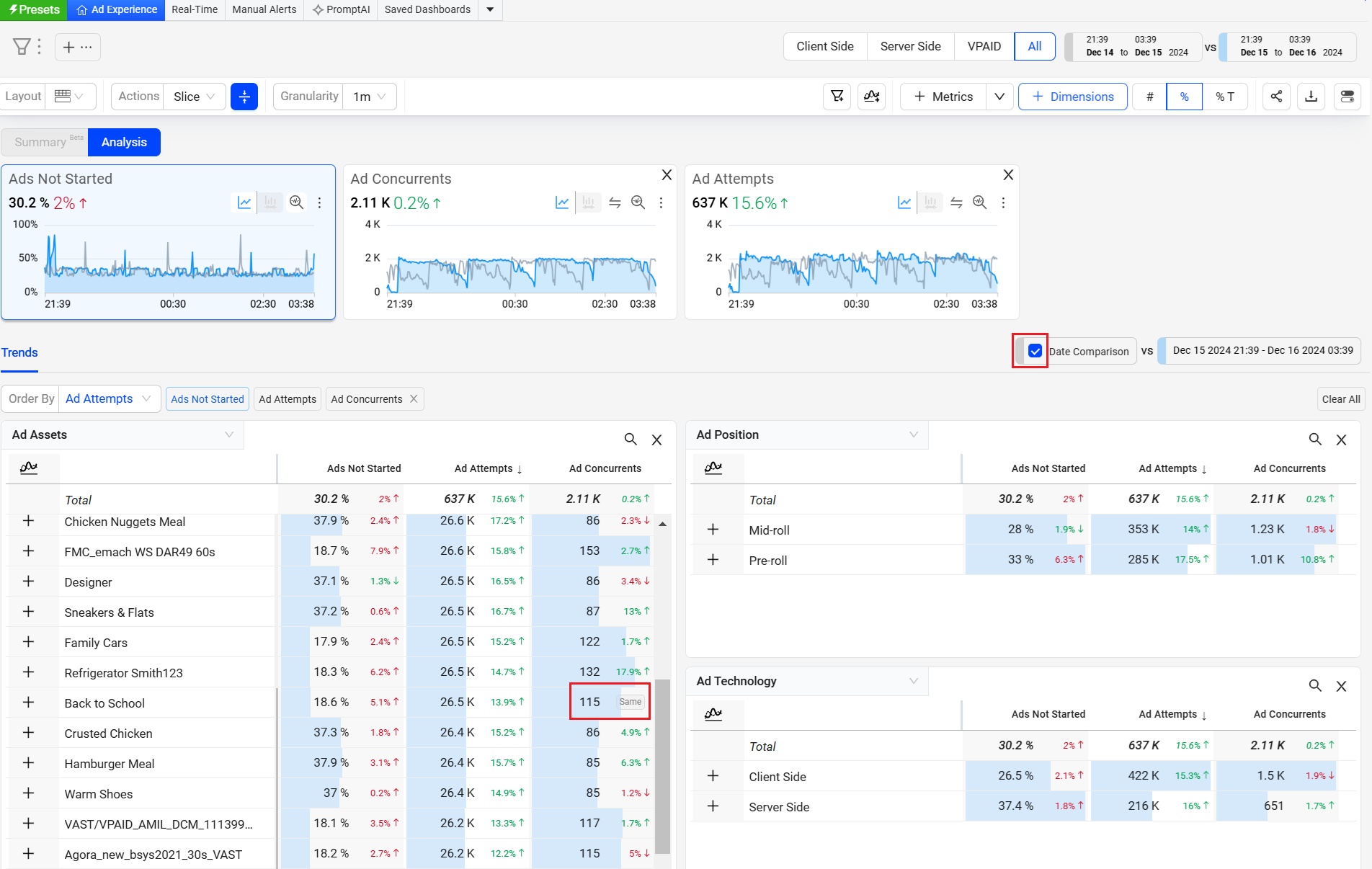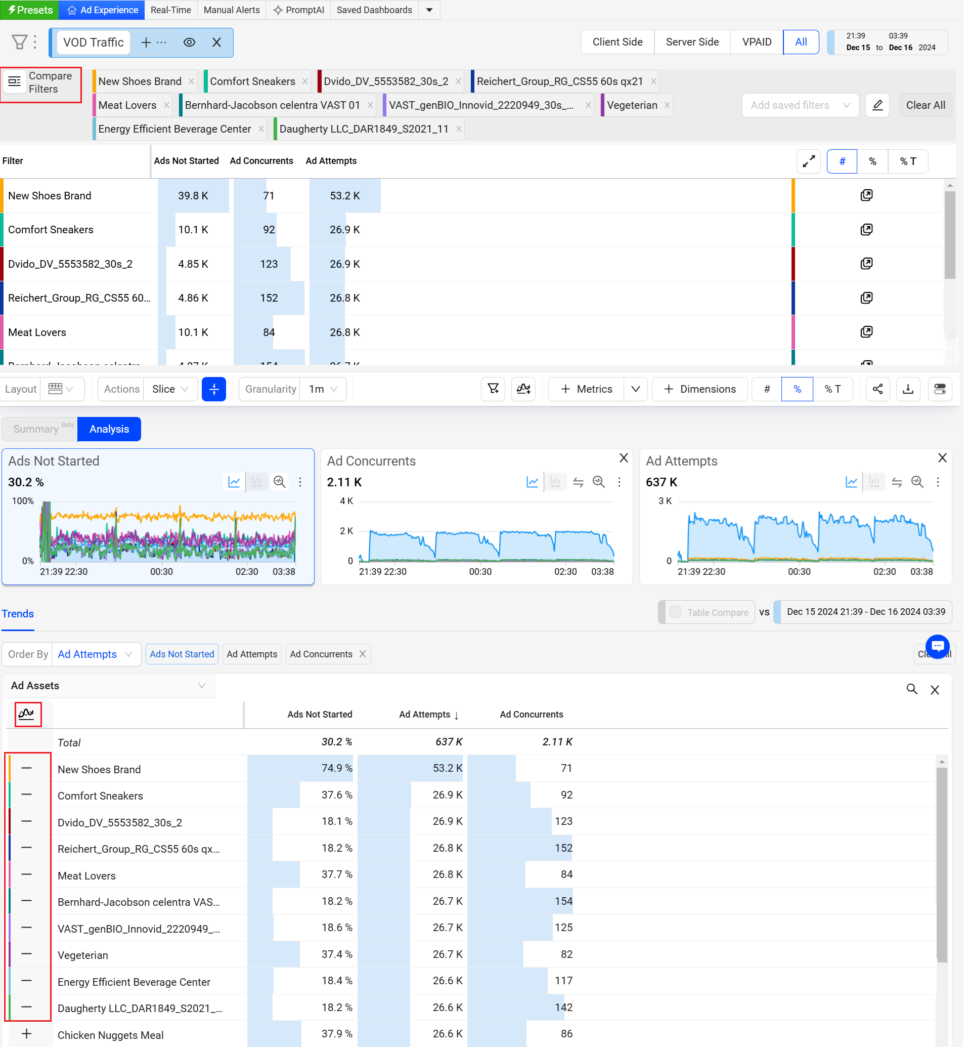 Conviva's enhanced Ads interface and feature set provide improved diagnostic workflow for ad creative QoE and ad engagement analysis. This workflow is powered by Conviva's high-scale, real-time, on-demand platform that provides fast data accessibility with more detailed data granularity, one-click, and combinatorial instant filtering, and enhanced analysis workflows.