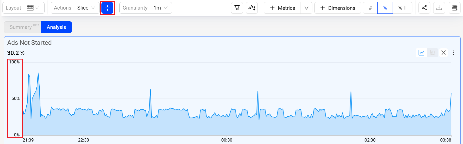 A visual presentation of ad metrics for actionable streaming intelligence in real time. Enhanced by selected filters and dimensions, you can monitor the performance of your most critical streaming KPIs with visual threshold crossing indicators to quickly identify and correlate changes in ad metrics.