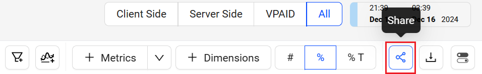 When a user opens the link, they see an exact copy of the dashboard you shared. They can change how Conviva Ads presents the data in the snapshot, but cannot change data that are part of the snapshot. For example, they can deselect metrics to hide them, but they cannot change the dimension or time series.