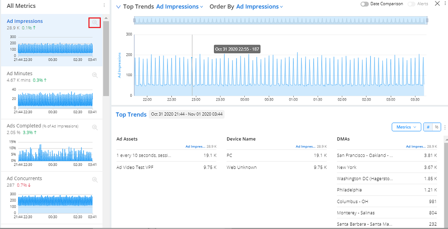 Use the Date Comparison and Alerts sliders to overlay a comparison time series and add alert indicators. You can click an alert indicator to display alert details.