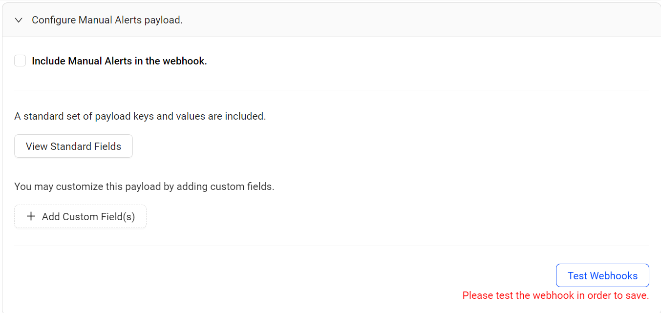 To include the manual alert payload, click the Include Manual Alerts in the webhook checkbox.