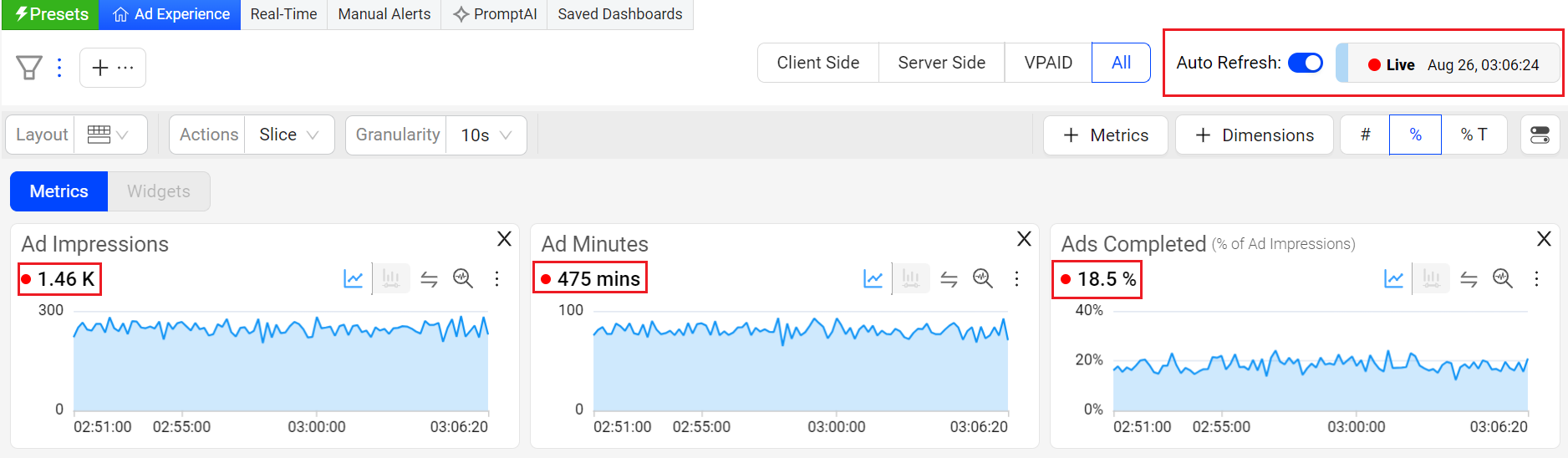 Ad Experience allows you to include the basic diagnostic data in the metric widgets. You can incorporate both Manual and AI alert specifics, offering a comprehensive perspective on both types of alerts.