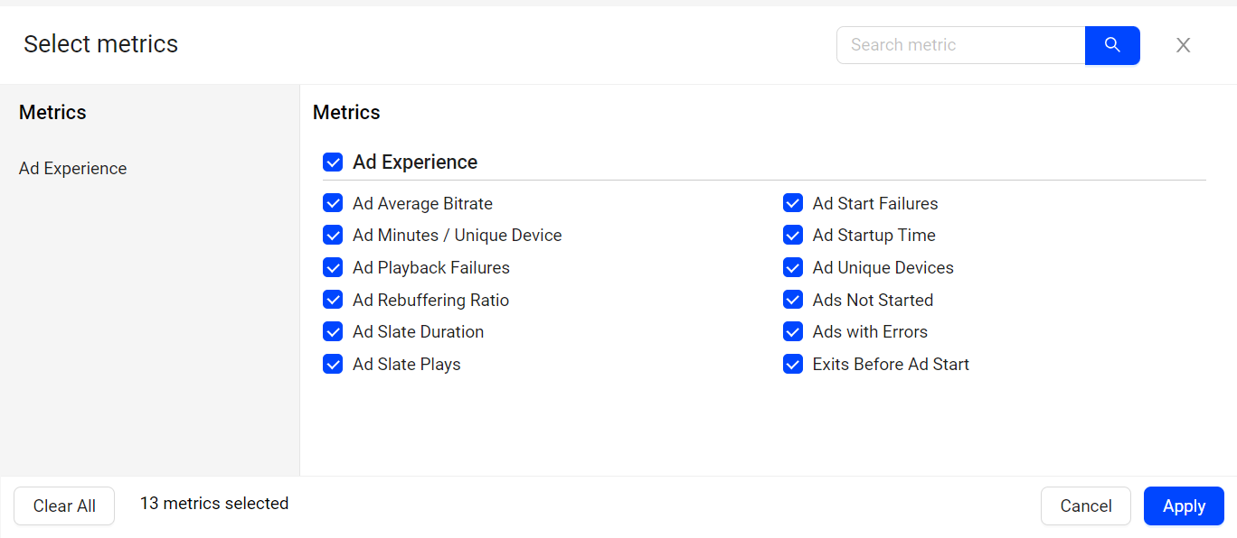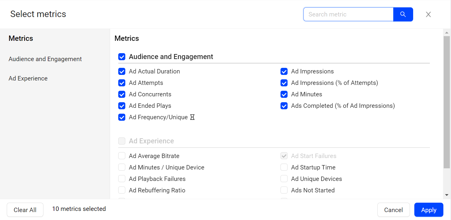 Ad Experience provides you the option to select the metrics from the metric popup page. Alternatively, you can utilize the search bar to locate the desired metric and select the metrics based on a search query.