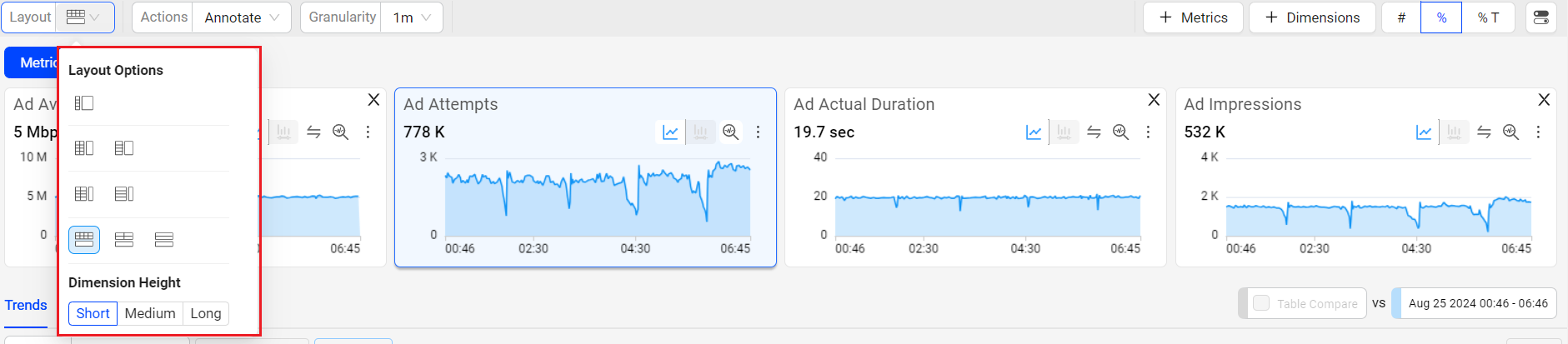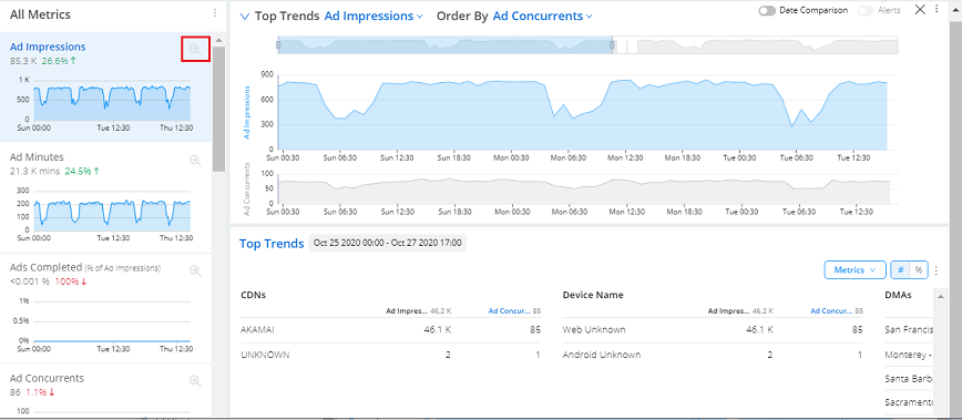 Click the diagnostic icon in a metric time series to display an expanded view of the time series above the Ad Experience data. For metrics with a Order By metric, such Ad Impressions ordered by Ad Concurrent Plays, a time series of the secondary metric also appears under the main time series for comparative analysis. Changing the Order By metric also displays the selected metric in the secondary time series.