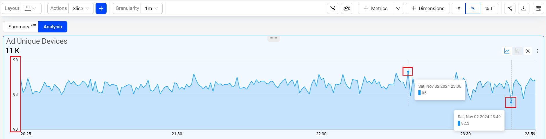 The Slice option in Ad Experience provides the option to select a portion of the time line which replicates the same timeline across other displayed metric widgets.