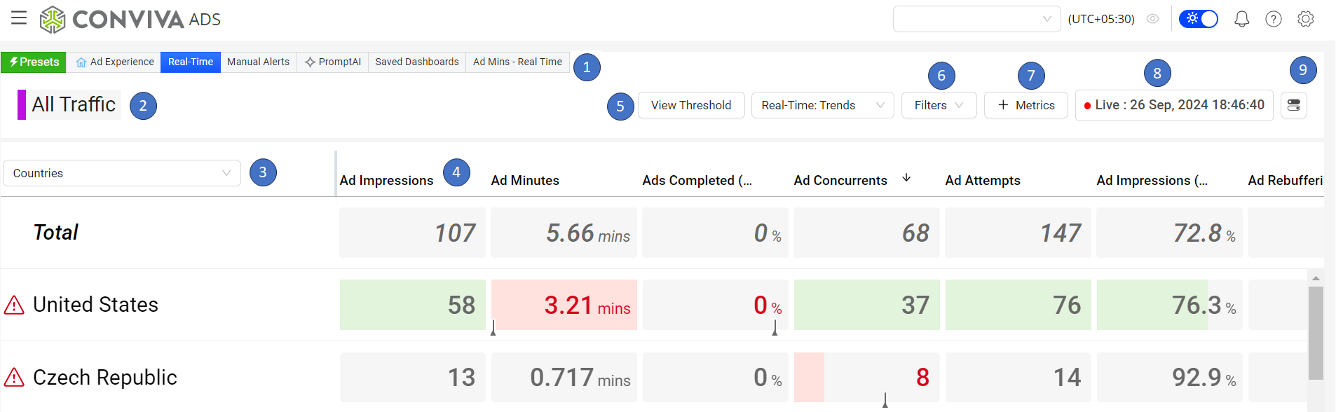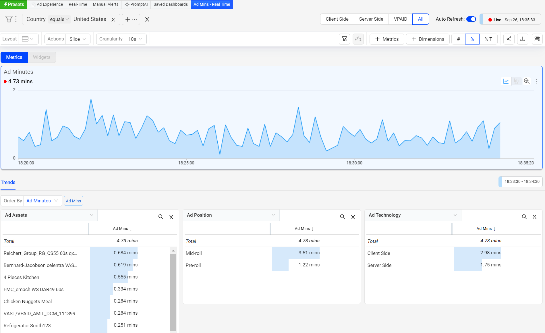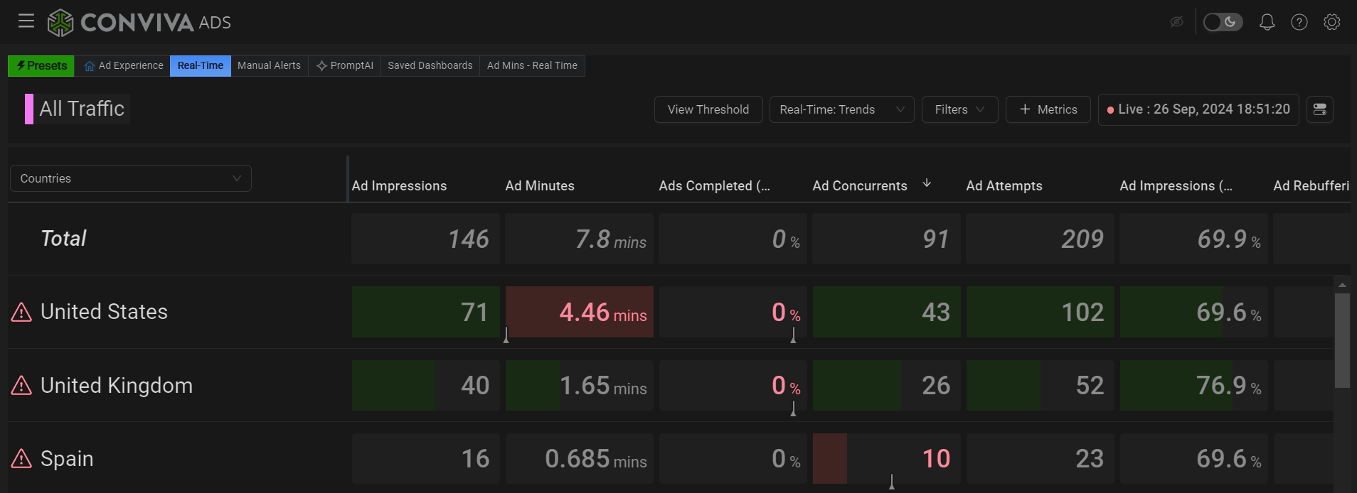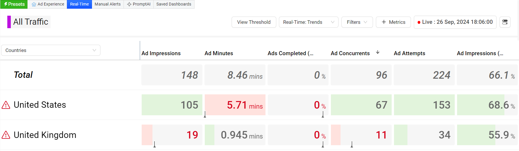 The Real-Time dashboard displays in light and dark modes for enhanced visual monitoring on desktops, tech ops centers and NOCs. By default, data is sorting by Ad Concurrents.