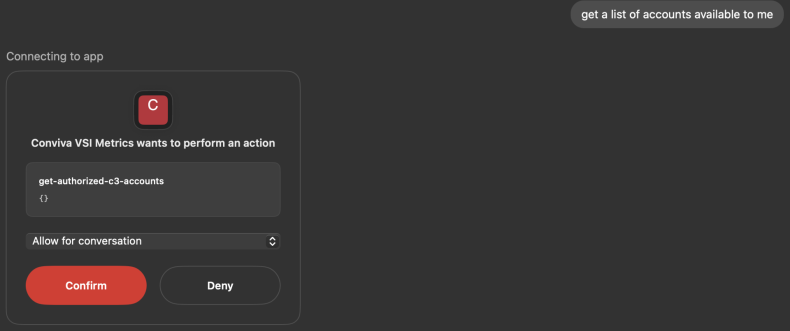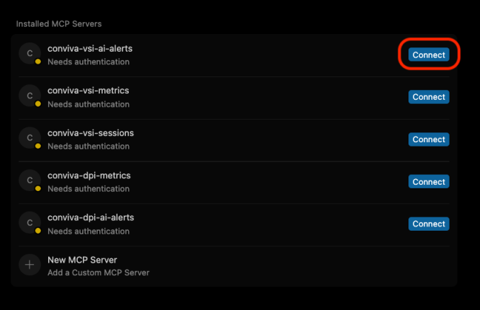 Conviva Connect MCP (Model Context Protocol) exposes Conviva data to MCP agents so Conviva customers can quickly and securely request Conviva data for MCP agent tasks. Whether providing a Support team with issue context before a Help Desk conversation commences with viewer operational data or automating operational performance reports, Conviva Connect MCP provides the foundation for extremely rich AI applications powered by Conviva data.