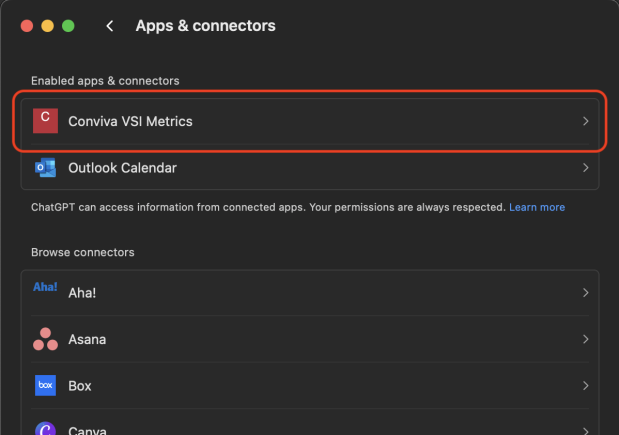 After connection, the Conviva MCP server appears in the Enabled apps & connectors list.