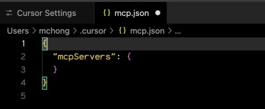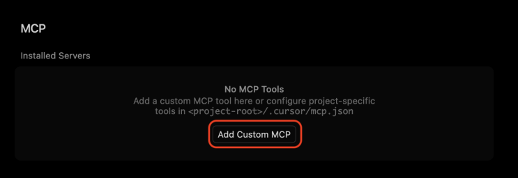 Click the Add Custom MCP button to open the mcp.json file, the configuration file for setting up MCPs.