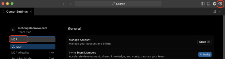 Click the Settings icon for settings and search for MCP; select the MCP option from the search result list.