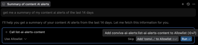 After first-time MCP access, Cursor asks for permission to use the newly added MCP tools. Add the tool to the “Allowlist“ or click Run for each access.