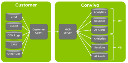 MCP is a common standard for Agents to interact with remote data sets. Conviva's MCP implementation builds on existing Conviva APIs, across VSI and DPI, which deliver time series, per-session, per-viewer, real-time and historical aggregated data. Through MCP, AI Agents can discover, query, and consume Conviva datasets dynamically. Agent requests can be built quickly using natural language queries, with insight inferred from the data automatically.