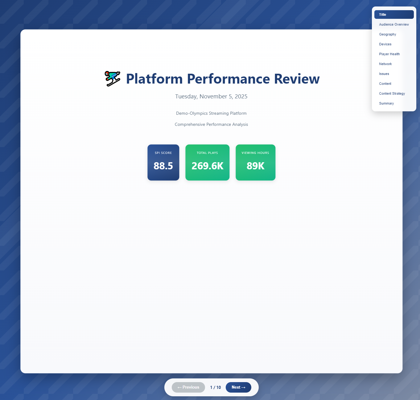 This data suggests the Demo-Olympics platform experienced consistent but manageable video quality issues during this 14-day period, with most being informational-level alerts that were resolved relatively quickly.