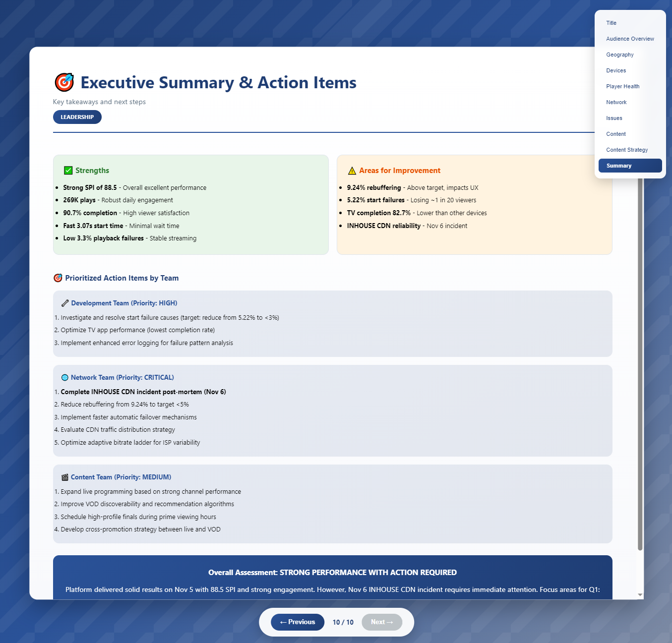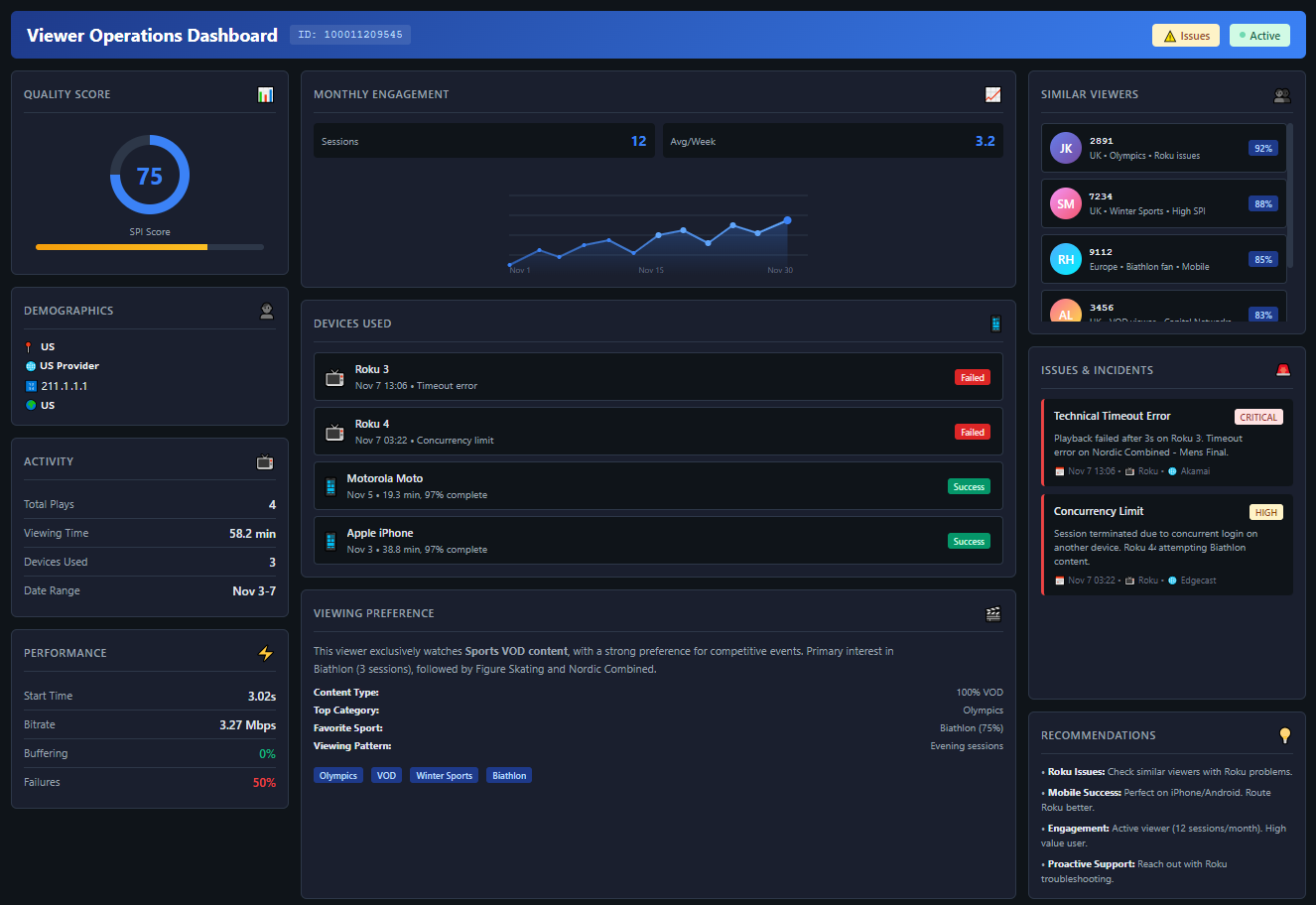With MCP request-generated dashboards, leverage the power of using Conviva VSI and Conviva DPI data sources compiling application metrics, AI alerts, and streaming sessions based on instructive agent requests, e.g., automated viewer operational analysis based on custom support inquires and operational performance reports for service level (SLO/SLI) compliance.