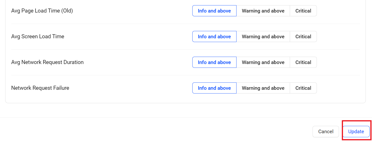 Select the desired severity levels for the metrics, and click Update to set the modified AI alert email subscriptions.