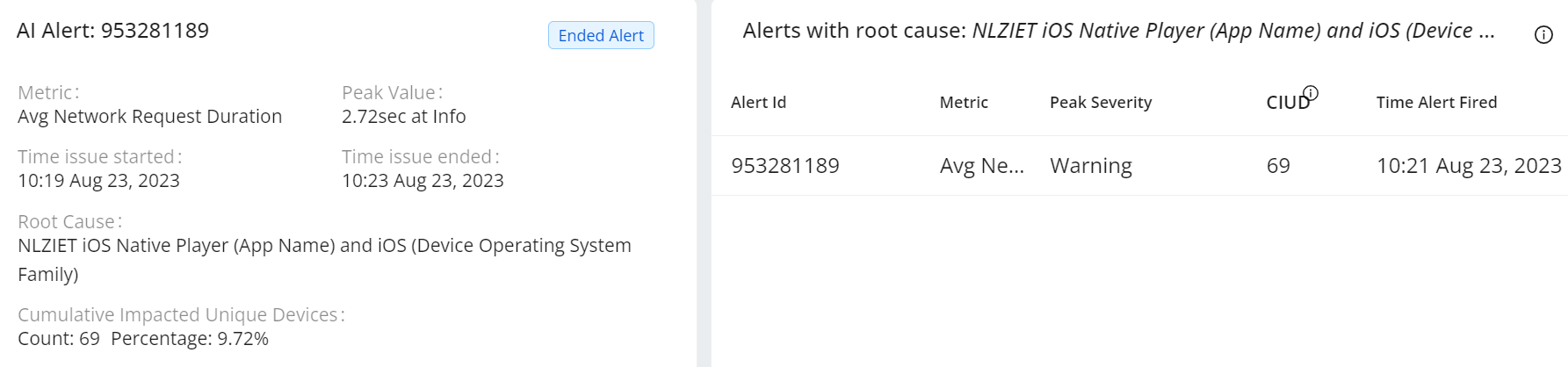 - Impacted Uniques: The cumulative total of devices impacted by the issue at the time the AI alert fired. (Not available for the new beta customers)