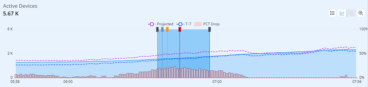 Conviva uses machine learning to compile an active device baseline (T-7 dashed blue line), which is determined using weighted comparisons with the previous 7-day device activity and the most recent device activity. Projected active devices (dashed purple line) is a proprietary algorithm based on a combination of derivatives and multipliers of multiple historical time series to calculate an estimated predicted active devices. This is used to calculate the difference from the actual, for which the percentage drop (PCT Drop) fires an alert when the percentage crosses the threshold while maintaining persistence.
