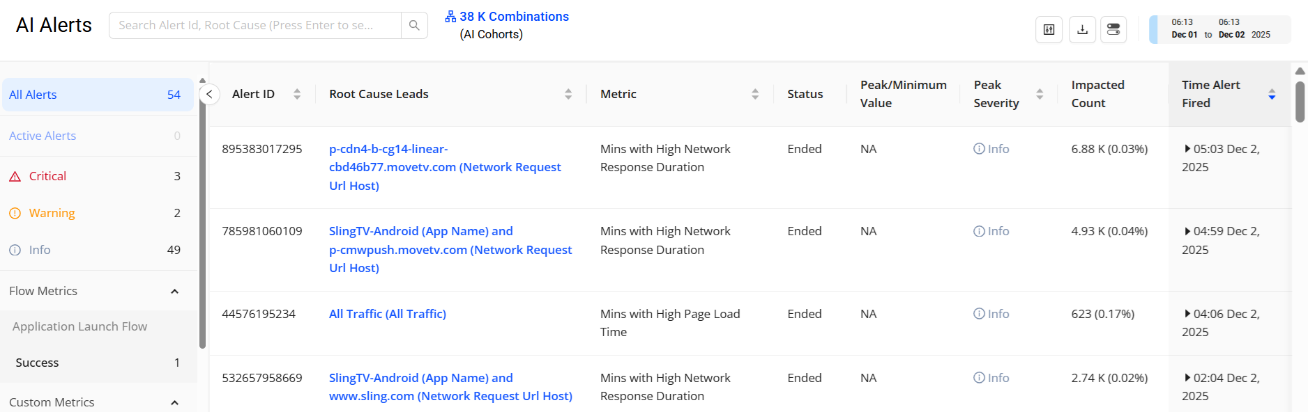 For each generated AI alert, the system displays the dimensions attributed to the root cause, and for further analysis provides a diagnostic time series of the metric variations leading up to the alert firing and continuing past the end of the alert. The AI alert system also displays a list of sessions that were impacted due to the alert and the device metadata associated with sessions to help you further isolate the root cause levels.