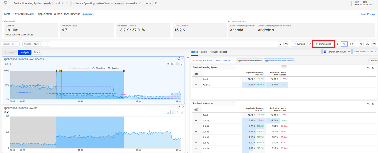 Click the Dimension button to specify the dimensions to display. The dimension associated with the root cause group is automatically displayed as the first dimension. The dimension selector displays standard dimensions, root cause group dimension, and any added custom dimensions.