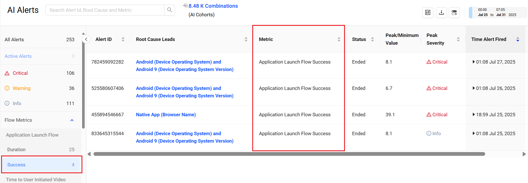 AI Alerts for Flow Success Rates that trigger when the success rate degrades below the configured success level. These AI alerts provide proactive notifications based on the flow success rate and the configured persistence.