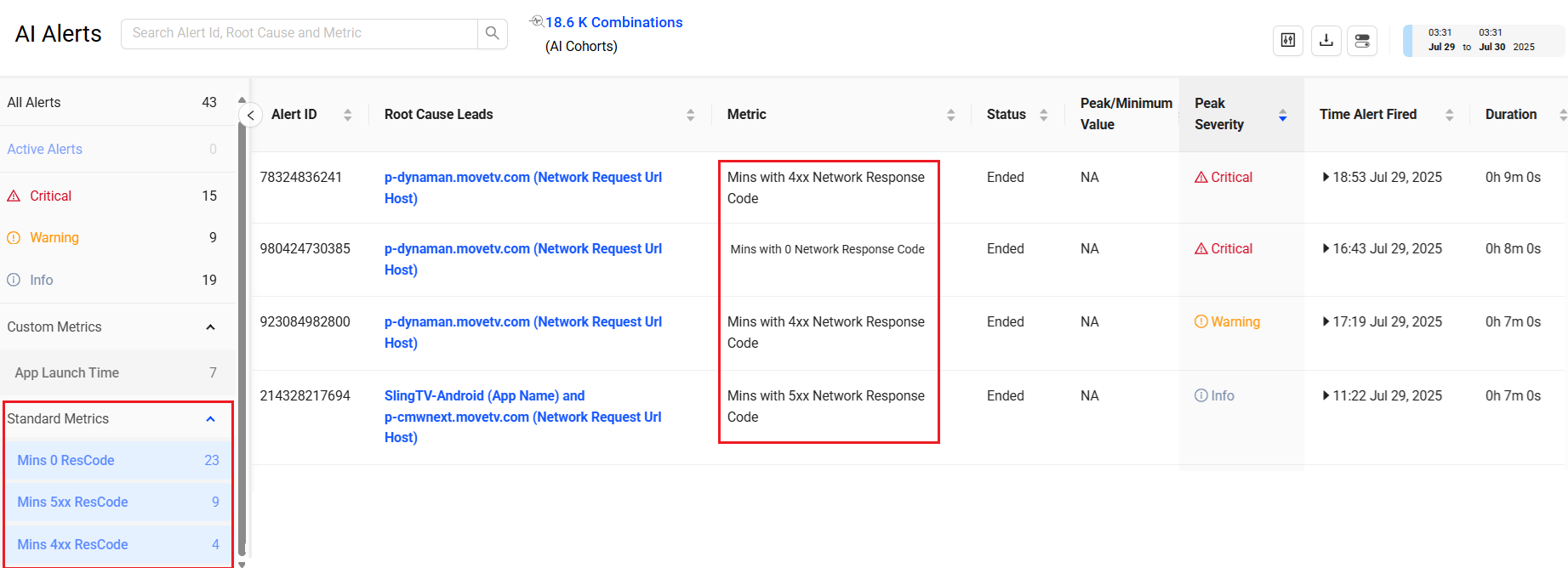 AI Alerts Success Metrics Success Metrics AI Alerts Diagnostics AI Alerts Minutes with Network Request Response Code Metrics Diagnostics
