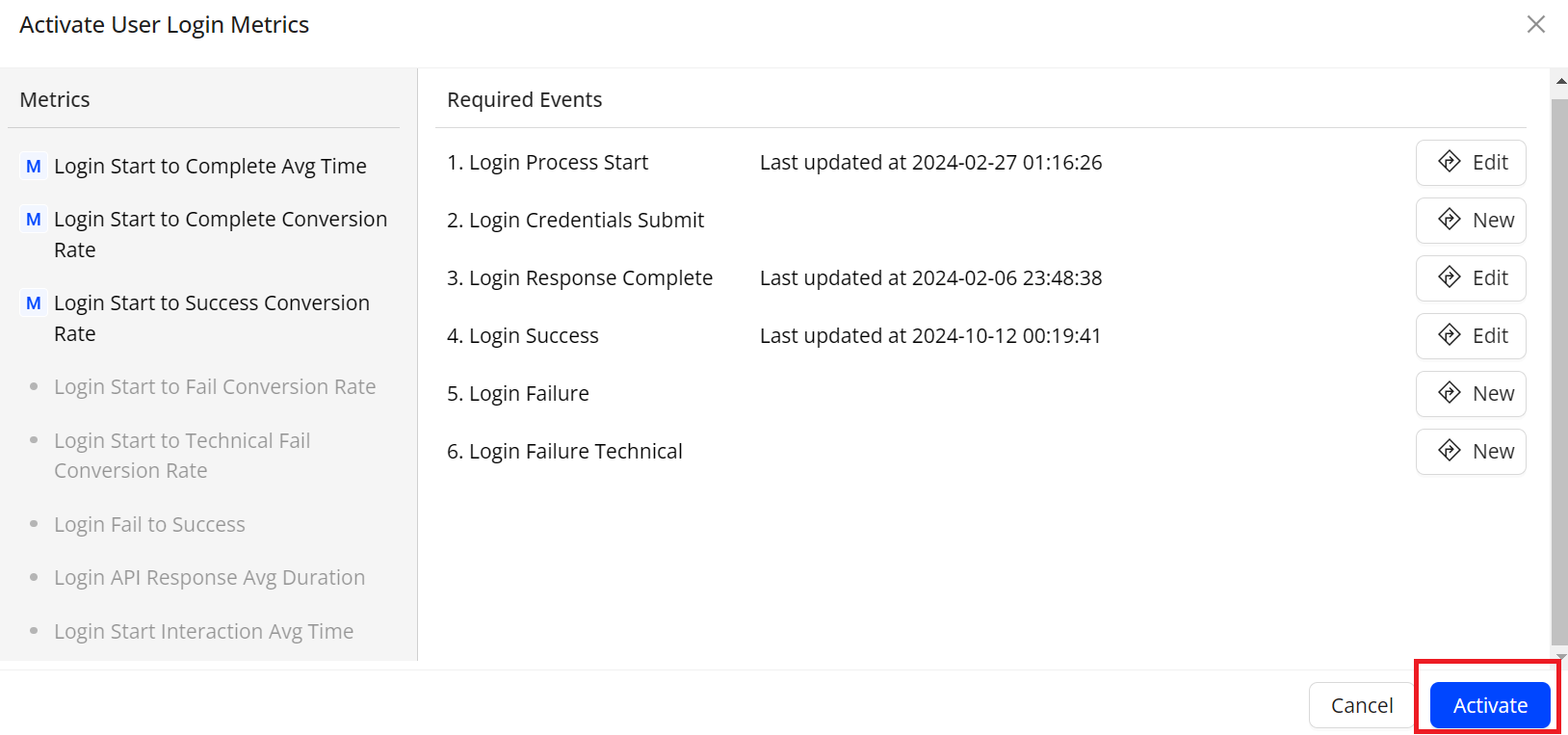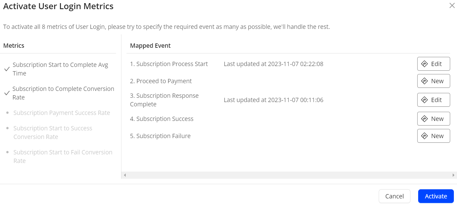 In the opened window, check the metrics and mapped events. Metrics displayed in a lighter color indicate their unavailability, suggesting the addition of specific events to enable these metrics.