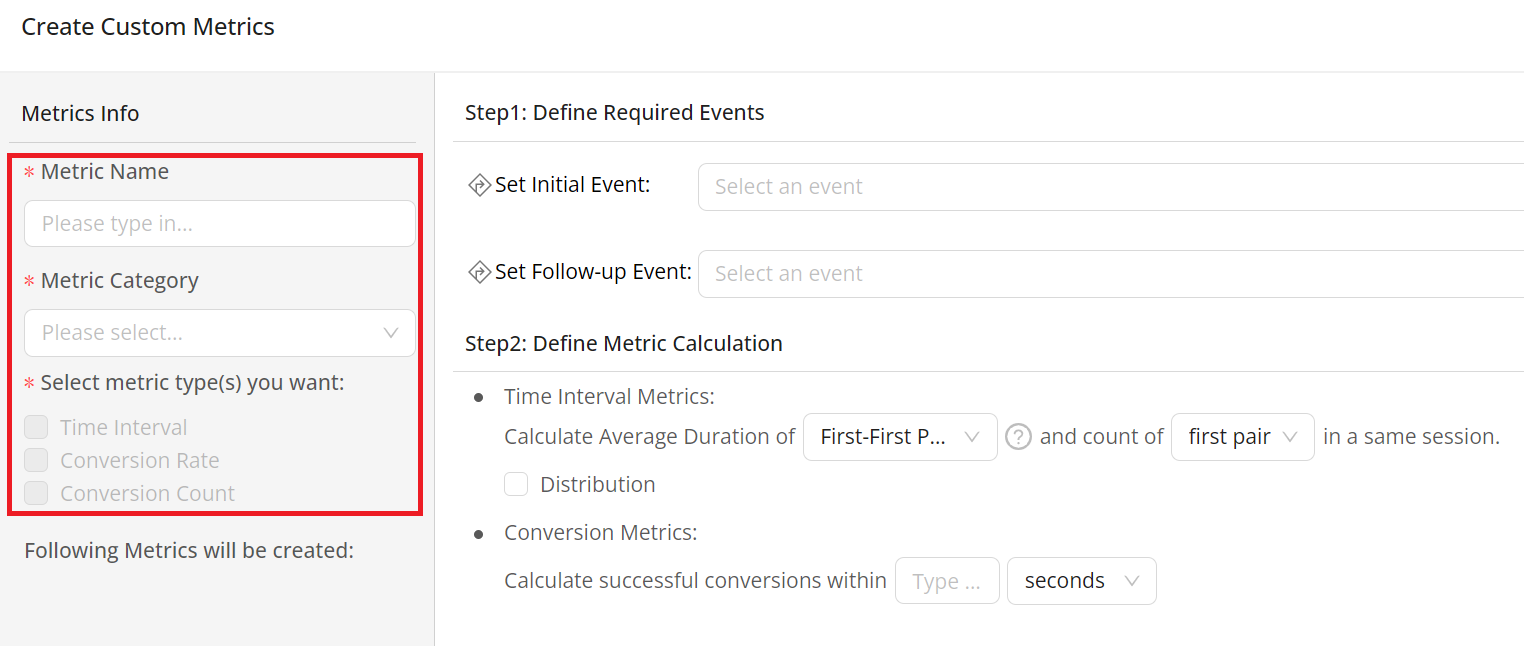 In the Create Custom Metrics window, fill in the metric name, select category and metric types.