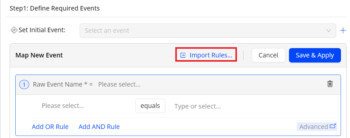 If you want to add mapping rules from an existing mapped event, click Import Rules, select a suitable mapped event from the drop-down list, and click Confirm. The raw event name, attributes and corresponding value are automatically filled out. You can proceed to make any necessary updates.