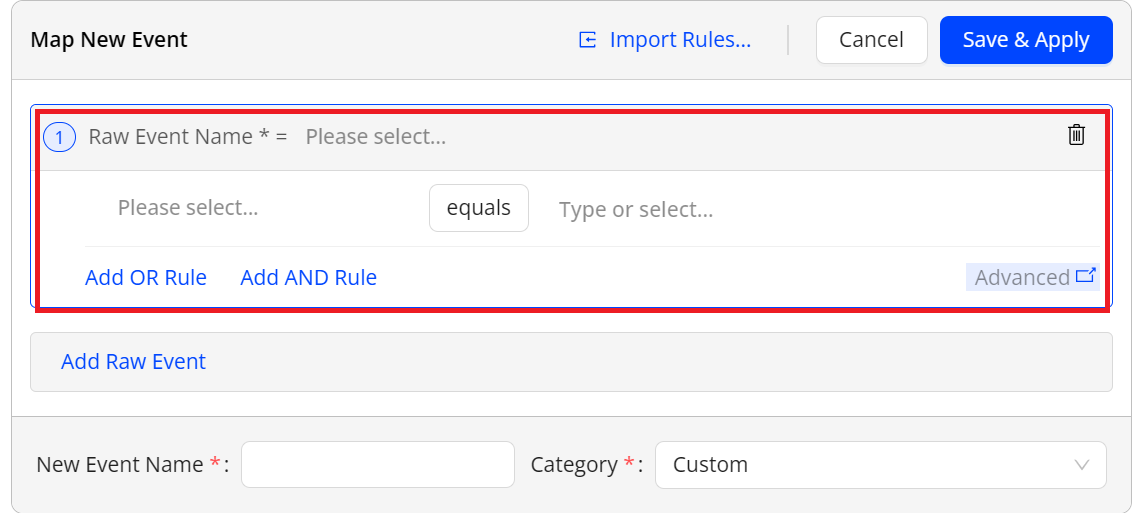 If you want to add mapping rules without referencing mapped events, select a suitable raw event from the drop-down list and set the corresponding attributes and values.