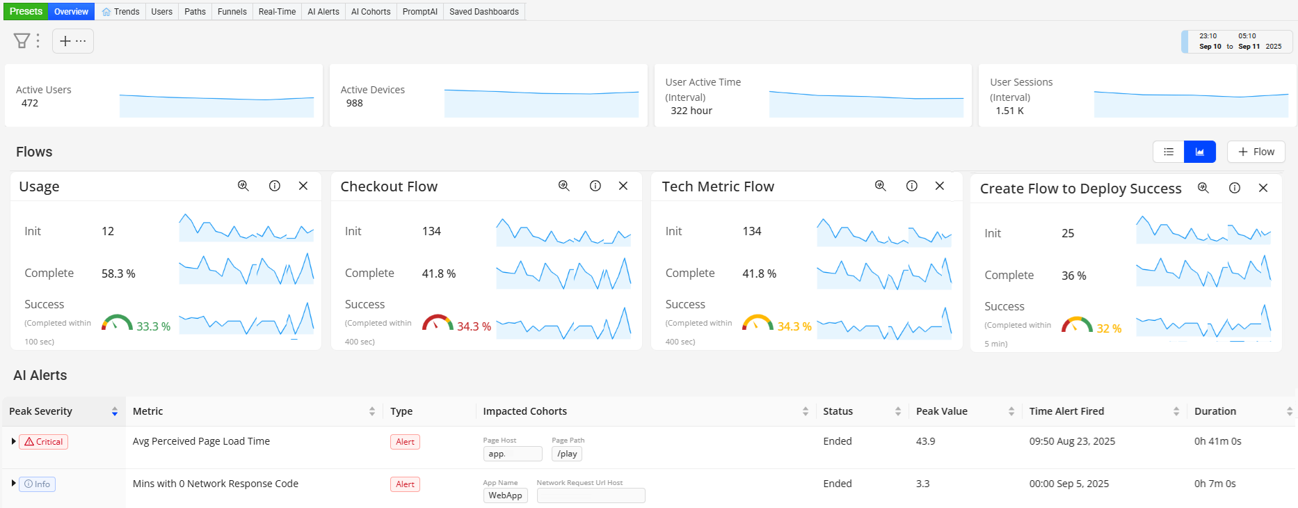 Overview Overview Overview Flows Frustration Signal AI alerts flows Al alerts key metrics key metrics active user active time user session interval user Frustration Signal active time interval
