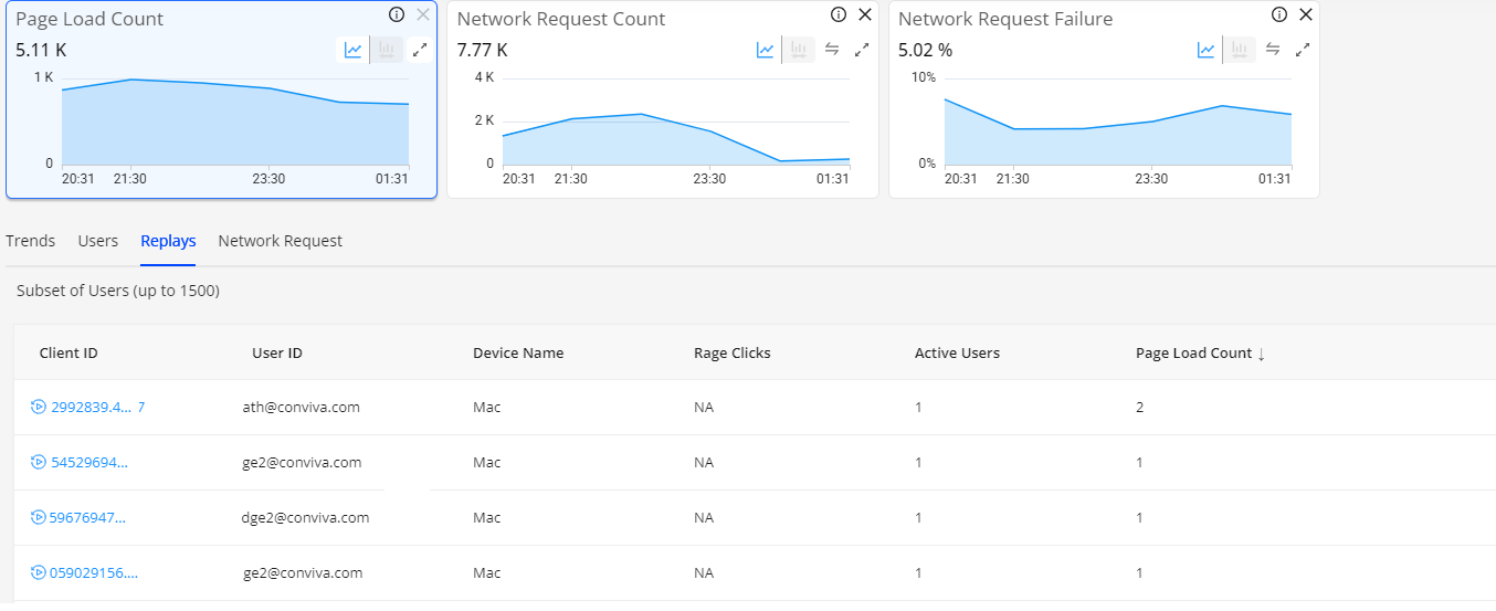 In Trends, select a metric time series and then click the Cohort Replay tab to view the available sessions and access session replays. For more details, see Cohort Replays. |