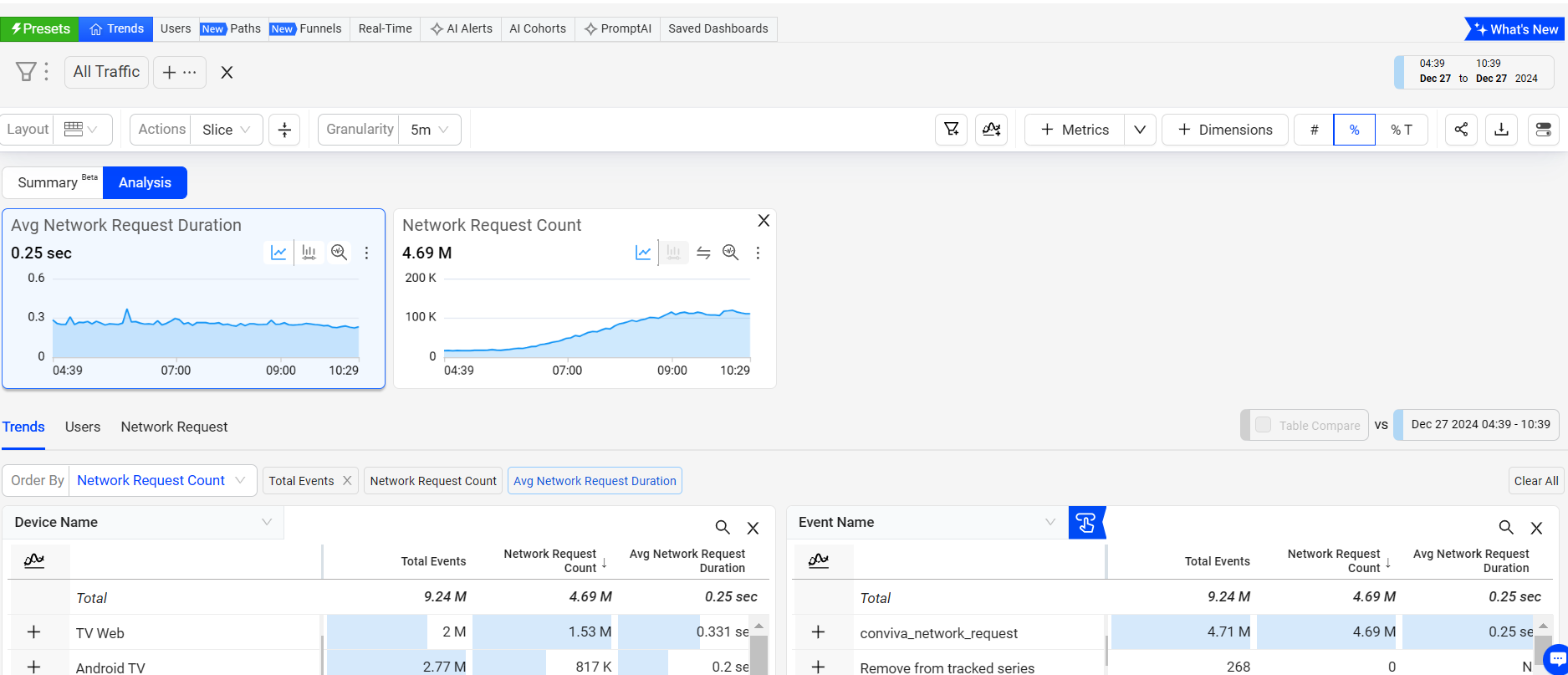 Conviva's DPI (Digital Product Insights) provides real-time, cohort-level insights and advanced features, connecting customer experience, engagement, and system behavior with business outcomes. DPI is powered by Conviva's high-scale, real-time, Digital Intelligence Platform that enables continuous tracking and measurement across dimensions, one-click and combinatorial instant filtering with unified insights into critical user flows and shared KPIs.