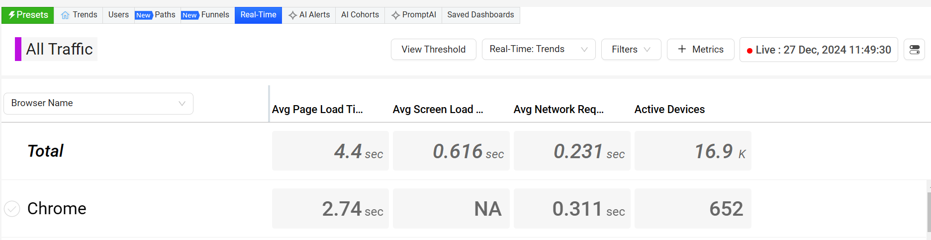 Conduct real-time and historical customer engagement analytics in a single pane of glass by selecting the Live mode or a specific time range. For more details, see Trends. |