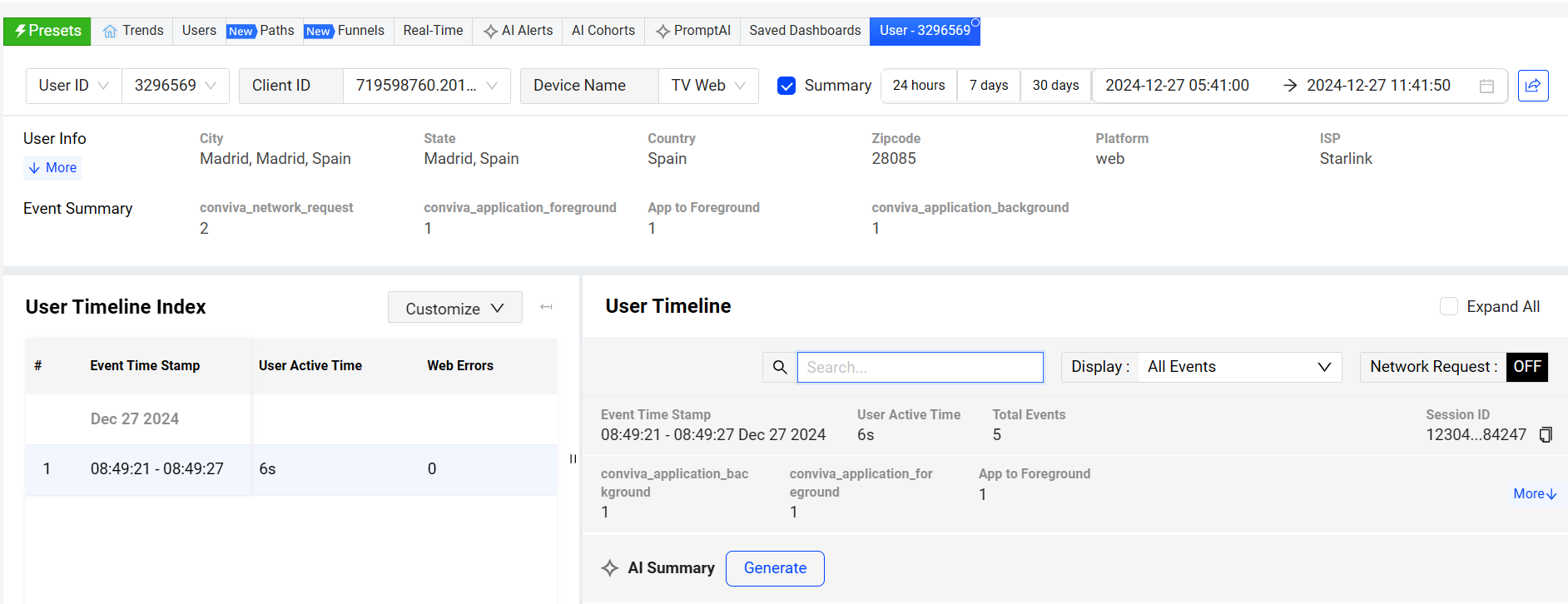 Customer Support Teams view detailed messages of an event time stamp and all events within that time stamp by clicking the time stamp in the User Timeline Index. In the User dashboard, leverage AI-generated summaries of customers' quality of experience to make it easier for agents to engage with them. For more details, see User Dashboard. |