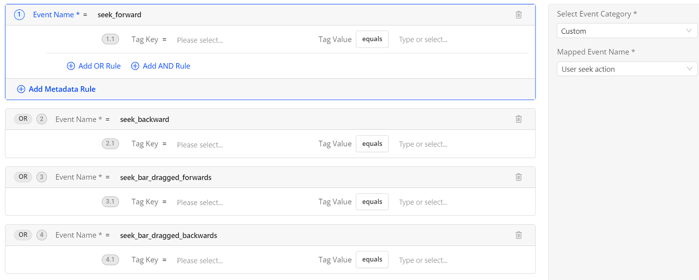 DPI enables different types of individual metrics. Start mapping from a Conviva predefined event, a custom event, or a combination of both as mapping rules to comprehensively track the desired user behavior.