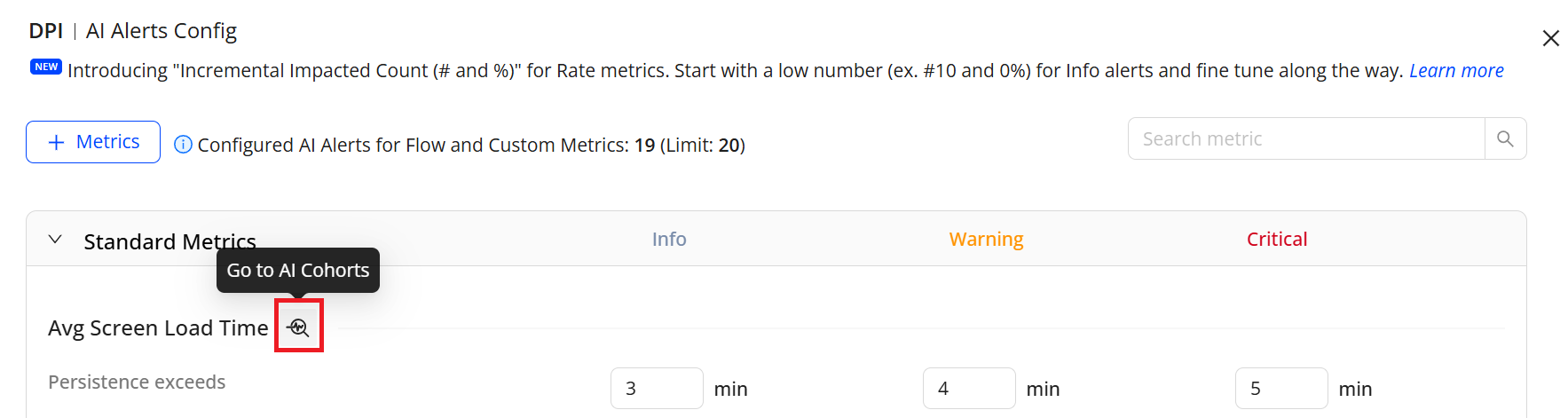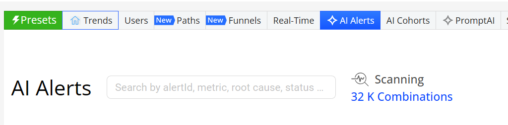 With Conviva AI alert cohorts, check the root cause groups monitored for AI alert performance and view the cardinality of alerting cohort combinations to understand the scale of the alert monitoring.