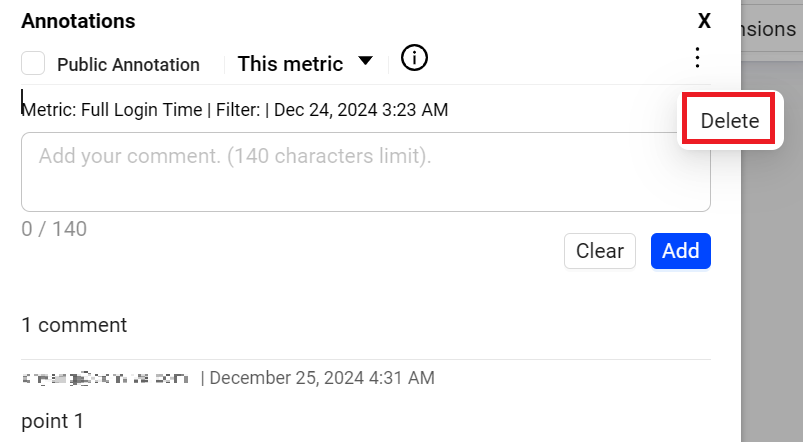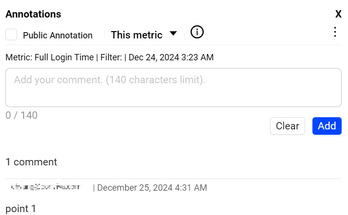 To make the annotation public, select the checkbox. The annotation is visible to all users accessing the account. From the dropdown list, select the option This metric or All metrics.
