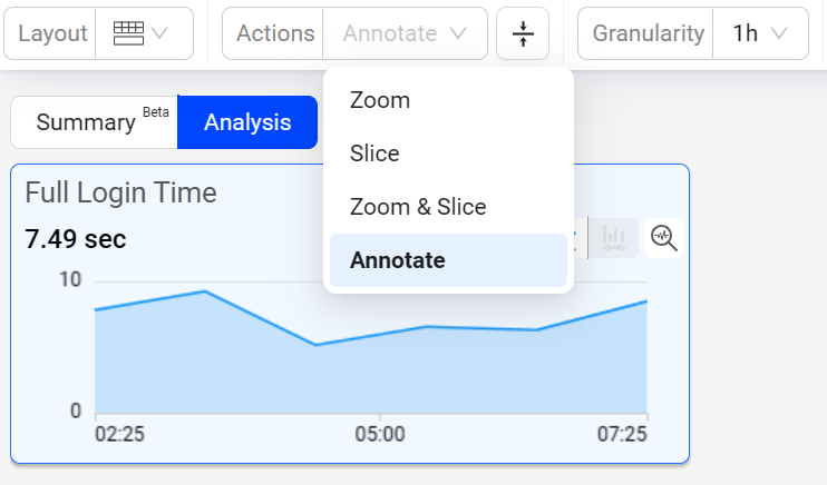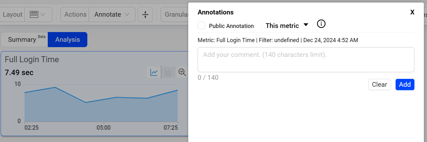 Annotations allow you to mark the anomalies in the timeseries during the data analysis within the selected time interval in Trends dashboard and Compare. Also, it enables you to add comments making it a collaboration tool.