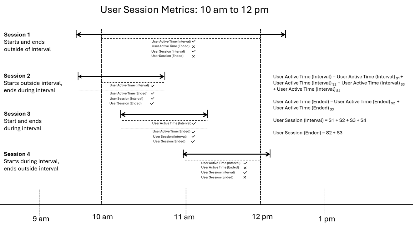 During this example interval, user session metrics are calculated as: