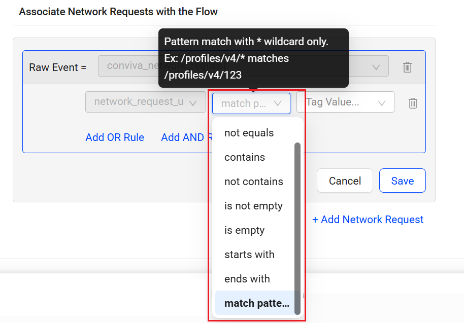 Note: To measure any network request from a specific page, such as a page whose path contains ‘profile’, use metadata as context to limit the network requests to those originating from that page. Metadata such as Country, Page Path, and Device Name serve as context to ensure that the configured event rule matches the selected metadata, enabling accurate measurement of specific traffic.