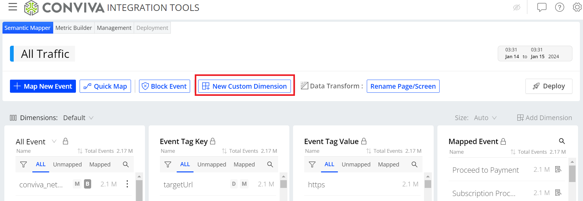 The Management tab allows you to effectively manage data such as metrics and events, including tasks for searching, reviewing, deleting, and deploying/undeploying to support your performance monitoring goals. The tab also allows you to do multiple selections of metrics, custom dimensions, and mapped events for deployment, undeployment, and deletion.