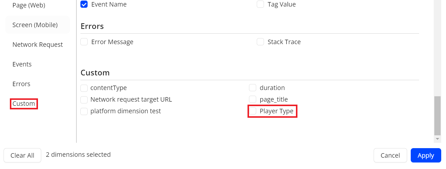 Create custom dimensions with values extracted from events to enhance your analysis of application performance and user behaviors, such as a dimension value extracted from only the play start and play end events.