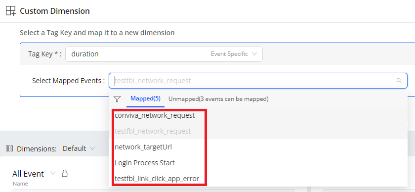 For event specific tag keys, select the events from which the dimension values are extracted. By default, select all mapped events. If you want to use specific mapped events, perform these steps:
