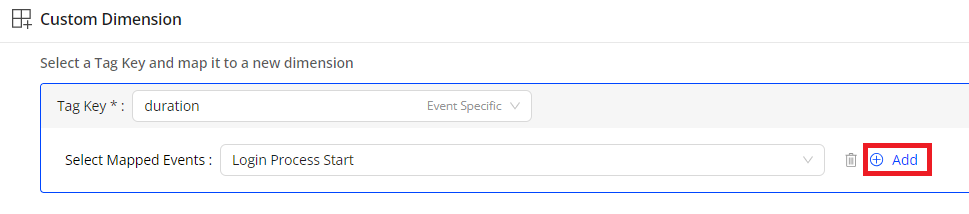 (Optional) To add more mapped events for the custom dimension values, click Add and select a mapped event. For example, selecting both play start and play end events to extract dimension values for a play duration dimension.
